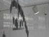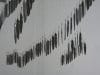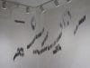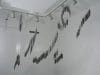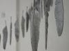 Falling Still, a collaboration with Yevgeniya Kaganovich, utilizes 200 cement-cast feathers as individual pixels to create a larger image across 6 planes. Each of these sculptures has been hand-poured into molds of actual feathers, exhibiting finely detailed quills on one side, and flat concrete surfaces on the other. They hang from the ceiling via discrete fishing lines, swinging, twisting and turning as viewers move around the 8 x 15 x 4 foot installation area. From all perspectives but one, the work floats between 1-dimensional lines, 2-dimensional planes and 3-dimensional pixels. View it exactly perpendicular to its planes, and all the work’s elements cohere into a bit-mapped image of a body, leaping through the air. While Falling Still is itself suspended between movement and stasis, it also moves and arrests us. The installation directs us in and around incongruous objects, through an improbable image, and across multiple dimensions.