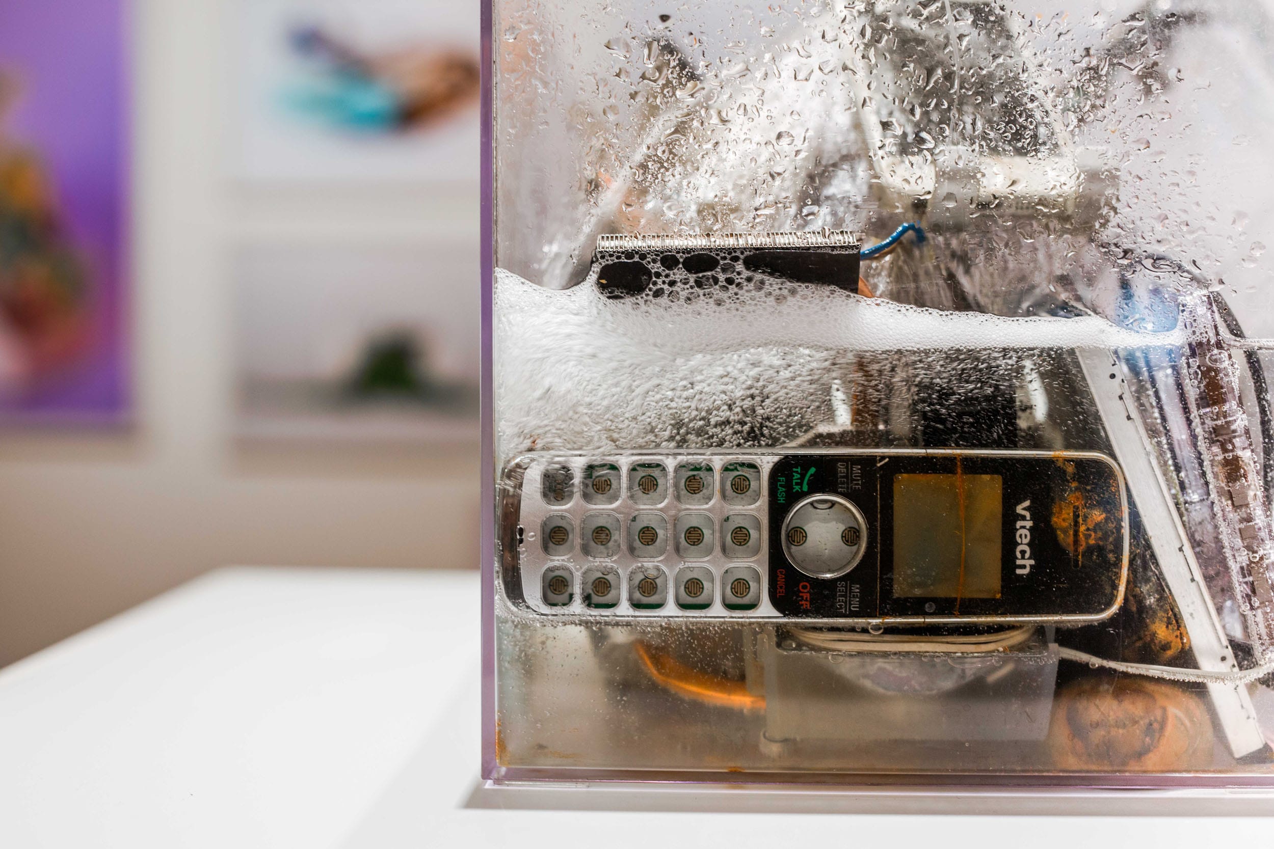Several of the Phossils series of sculptures also more readily reveal our lab/studio methods, and two of them break down over the course of the exhibition itself. These Ecokinetic Sculptures see a pile of phones in an air fryer, hard drives in a toaster, a water fountain cracking and peeling the glass of an iPhone (more quickly than you would expect), and a flipping hourglass that sands down a smart phone every sixty minutes.