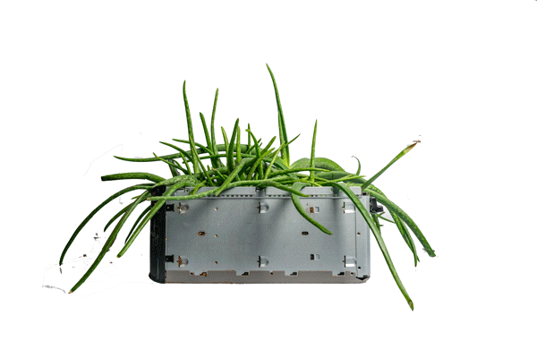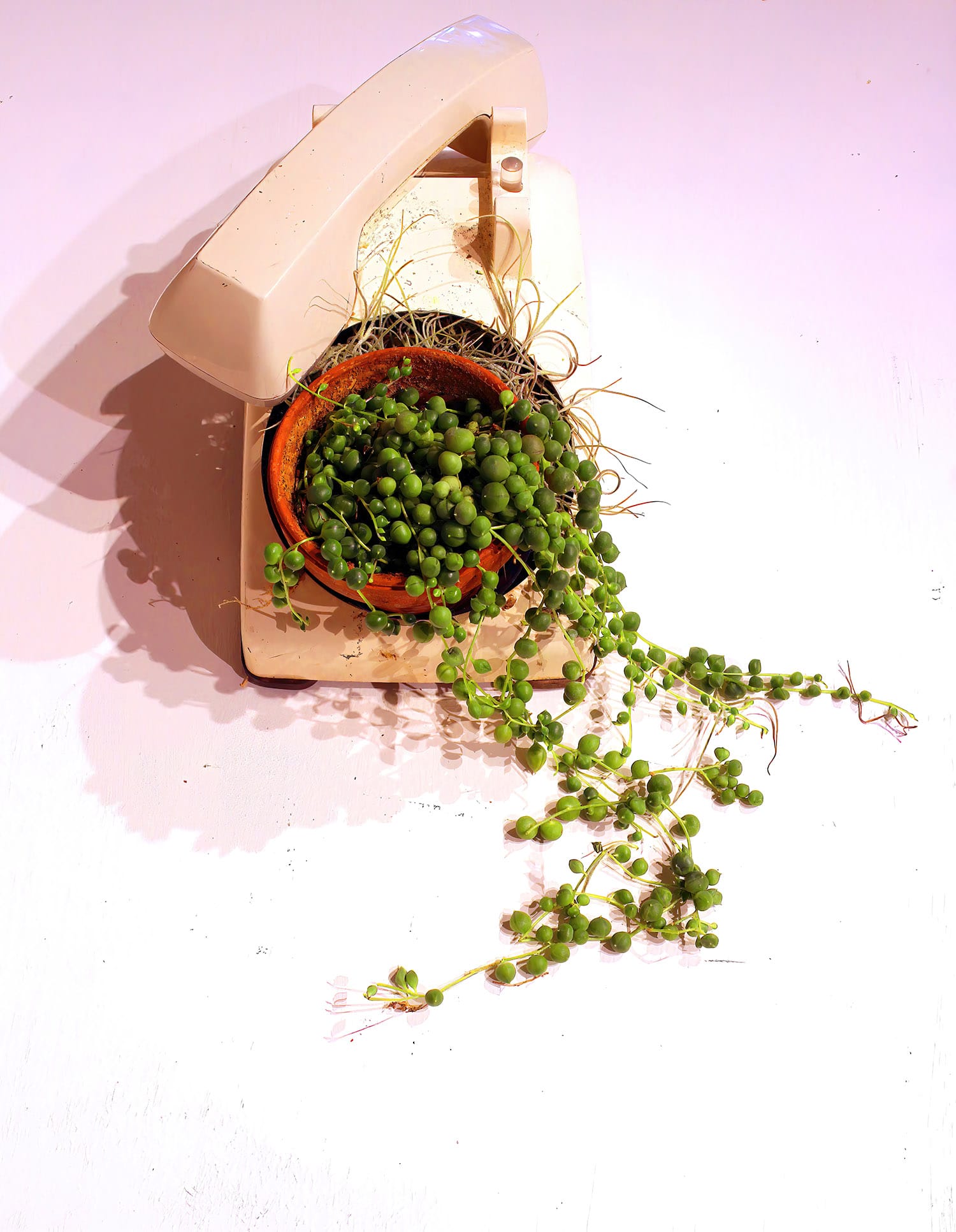 Server Farms take up Weisman’s core proposition: nonhuman life retaking the planet. Here repurposed computers and other technological equipment function as planters: an Apple watch grows moss and mushrooms; in a gutted iMac, grass replaces the screen and motherboard; an old telephone sprouts shrubbery through earpieces and keys. Each flowers, flourishes, incubates, and spreads. What life may spur, how might techno- minerals diffuse? Server Farms are also combined with Phossils in installations (The Wall After Us) and photographs (Drivers).