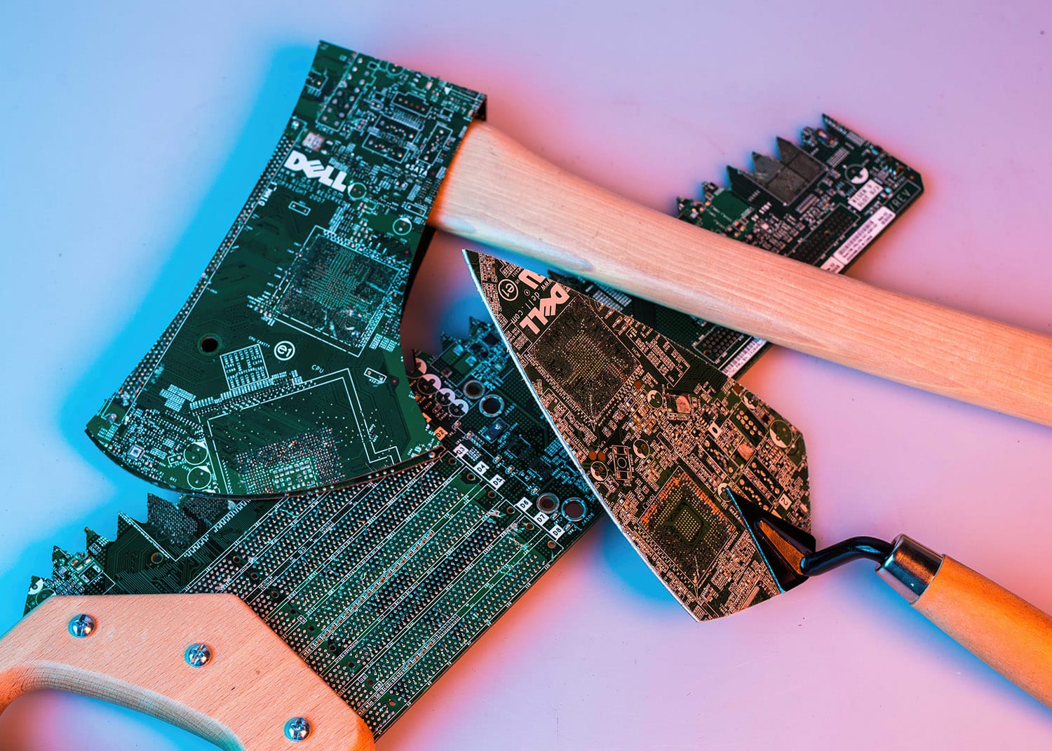 And can we reinvent what digital waste might be and do right now? utilities see e-waste re-thought as a raw material, and transmuted into other (somewhat) usable forms. In Phonēy Prints, for example, mobile phones are ground into a fine powder, and mixed with extender to turn them into ink for fine art prints (of phones), on paper made from my old t-shirts. Applecations see melted aluminum iMacs from the late 2000s cast into a hammer, screwdriver, and wrench. And Circuitous tools are routed circuit boards turned into a saw, axe, and trowel. These ask viewers to be curious and imagine, to test, play, and transform. We should not only ask what digital media will be and do, after us. We must reinvent what digital waste can be and do, in the present.