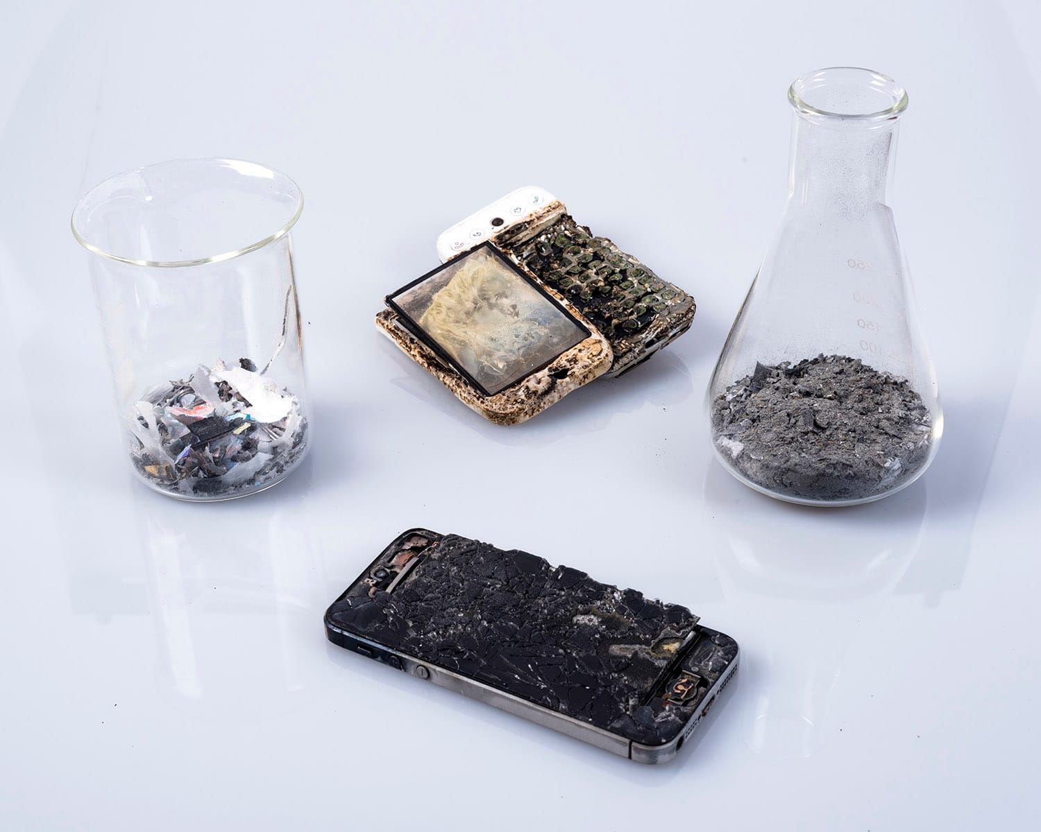 For example, the exhibited Phossils are, more or less, fossilized phones. These are mobile and other devices subjected to heat and pressure, extreme cold or high speed blending, and/or pyrolysis (as part of a collaboration with a biochemist and professor at Cornell University) to create a kind of artificial, geological time. Cook, freeze, burn, smash, blend, and more… and put the results on exhibit as sculptures and photographs, in beakers and tubes, on pedestals and stands, as staged archaeological finds and/or as large-scale installations on walls and towers. This work is not post-apocalyptic; rather, it imagines potential futures while asking viewers to be mindful of their media in the present.